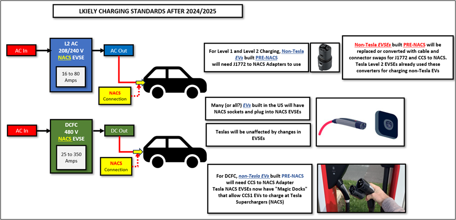 All (non-Tesla) US EVs to date come equipped with the J1772 and/or CCS socket connections and all Teslas to date come with the NACS connectors. In December 2022, Aptera Motors became an early adopter of NACS on their EVs. [i] In May 2023, Ford and in June 2023, GM and Rivian announced they will adopt the NACS connectors in future models, perhaps starting in 2024 or later. [ii]. [iii] A good possibility exists that NACS will displace all the J1772 and CCS standards over the next few years for all new North American EVs, and therefore the EVSEs. The jury is still out on the details, the timing and the costs to consumers, but when considering adding EV charging stations and purchasing EVs, market participants should be aware of this. The good news is that with one standard, all EVs can charge at all EV charging stations, at some point in the future.[iv] Also, so far this appears to be a simple technical change for EV and EVSE owners.